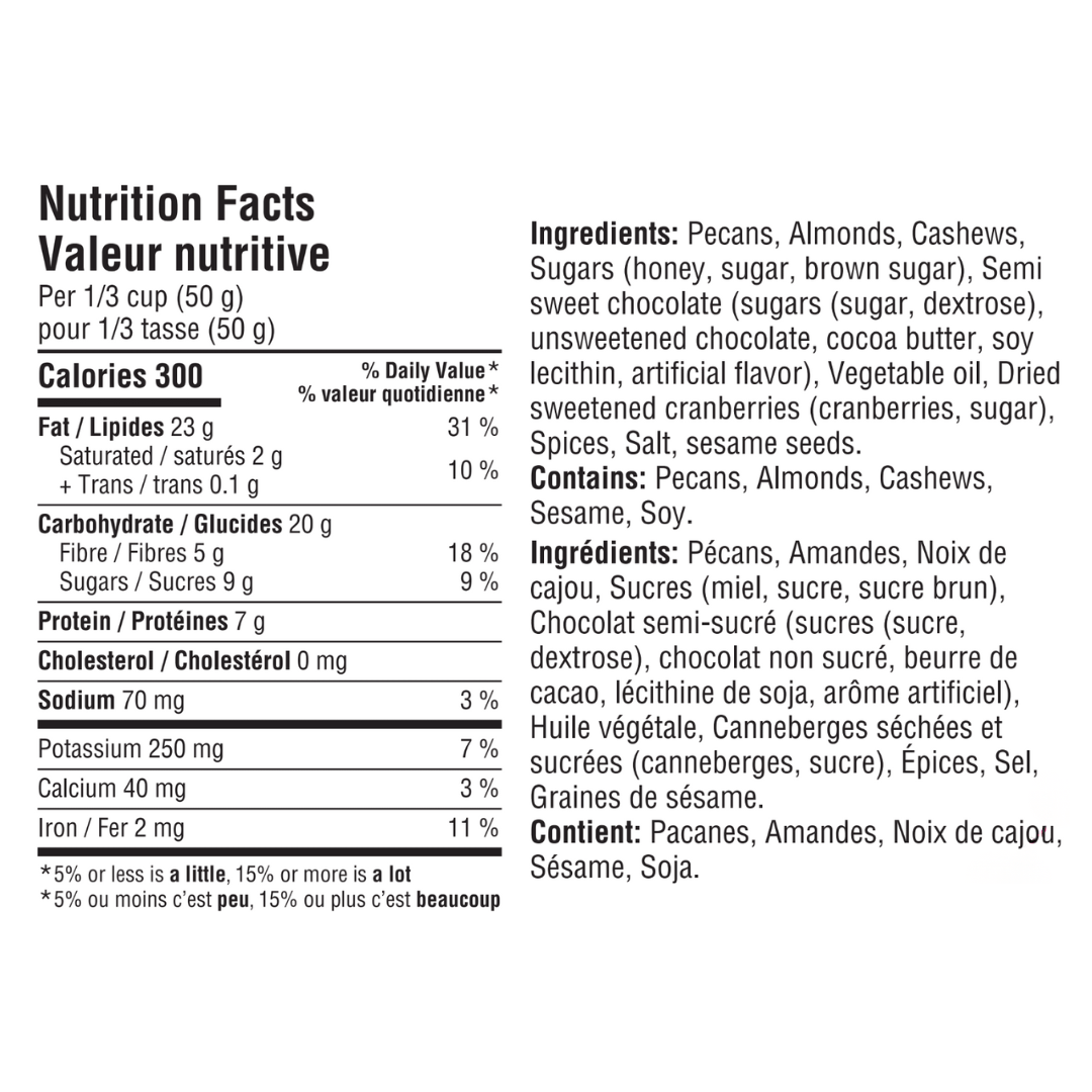 Elevate your snacking experience with this flavour-packed combo of cayenne, cardamom & ginger roasted nuts, dried cranberries & dark chocolate.